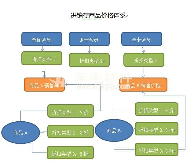 商品的批发或零售销售价格通常是统一制定的,营业员不能随意修改,但是由于店铺和会员等级的不同价格也有所不同,甚至要求某种商品可以单独设置折扣。根据这种需求,系统可以根据店铺设置价格类型,根据会员设置折扣类型,形成以价格类型和折扣类型组合的价格体系,如下图: