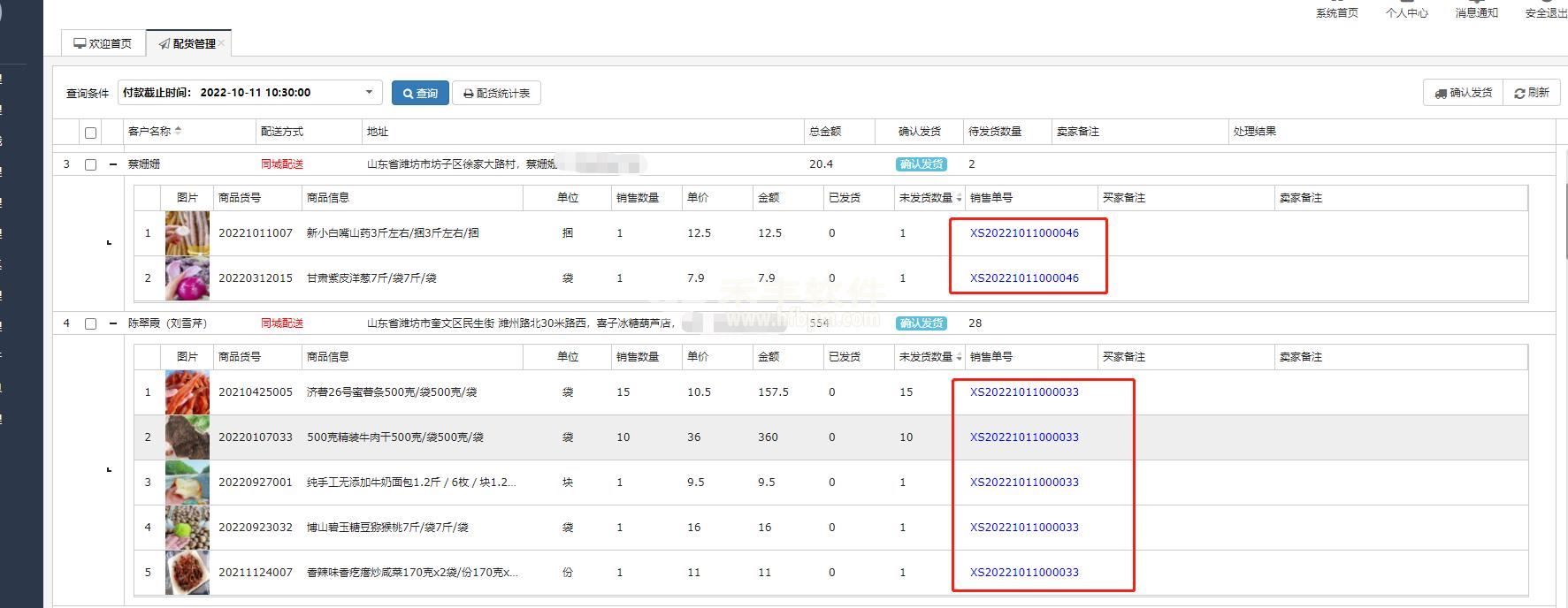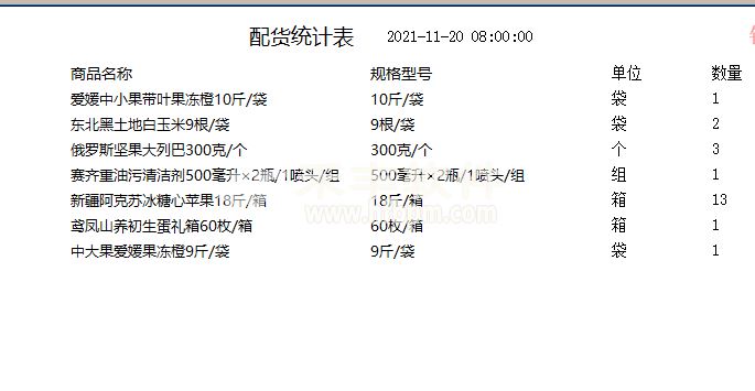 在每天配货时,还可以打印总配货单,统一分拣商品,然后再根据上述汇总后的发货单分别打包。