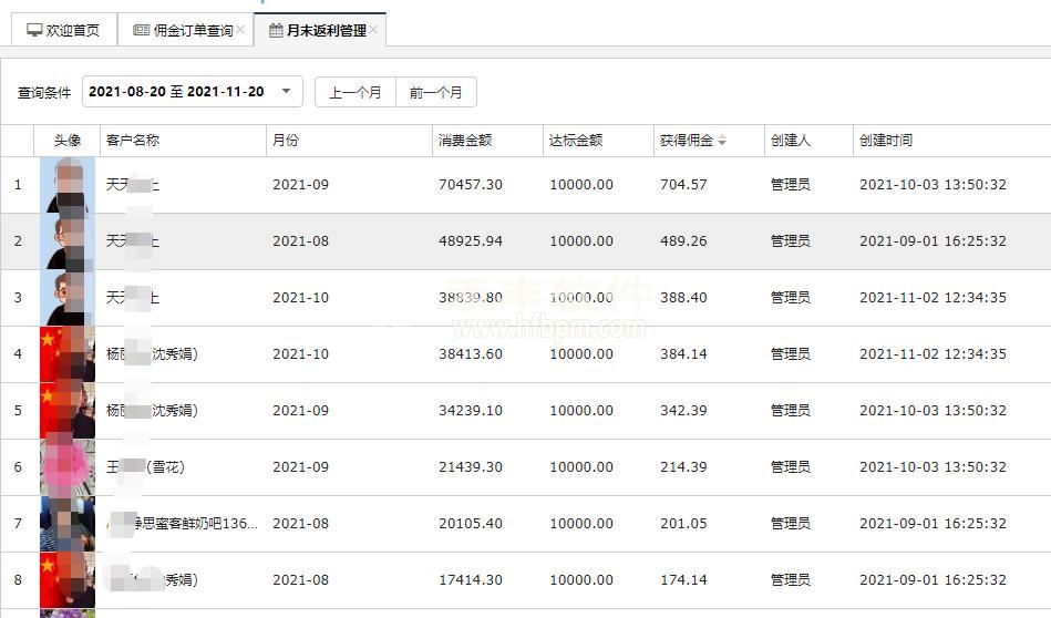 系统支持对团长每月满一定金额时按比例得到佣金。
